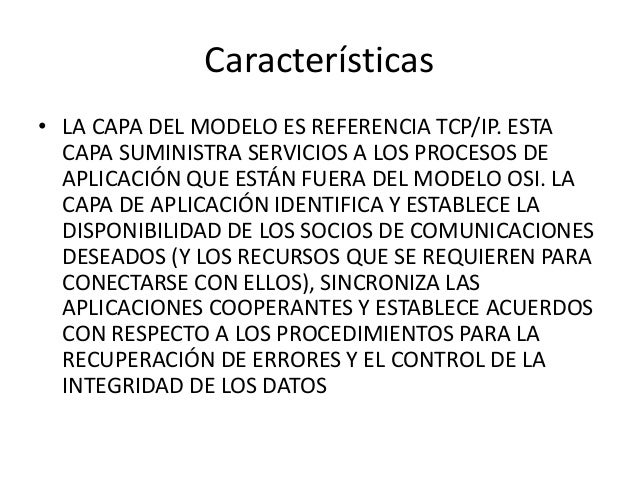 - Características• LA CAPA DEL MODELO ES REFERENCIA TCP/IP. ESTA CAPA SUMINISTRA SERVICIOS A LOS PROCESOS DE APLICACIÓN QUE ESTÁN FUERA DEL MODELO OSI. LA CAPA DE APLICACIÓN IDENTIFICA Y ESTABLECE LA DISPONIBILIDAD DE LOS SOCIOS DE COMUNICACIONES DESEADOS (Y LOS RECURSOS QUE SE REQUIEREN PARA CONECTARSE CON ELLOS), SINCRONIZA LAS APLICACIONES COOPERANTES Y ESTABLECE ACUERDOS CON RESPECTO A LOS PROCEDIMIENTOS PARA LA RECUPERACIÓN DE ERRORES Y EL CONTROL DE LA INTEGRIDAD DE LOS DATOS
