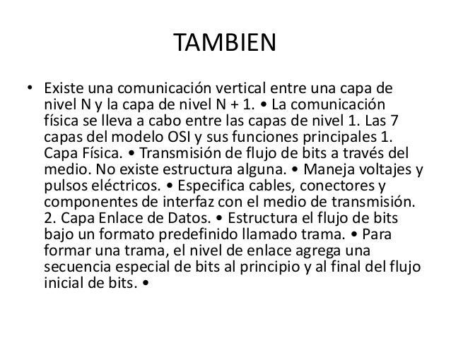 - TAMBIEN• Existe una comunicación vertical entre una capa de nivel N y la capa de nivel N + 1. • La comunicación física se lleva a cabo entre las capas de nivel 1. Las 7 capas del modelo OSI y sus funciones principales 1. Capa Física. • Transmisión de flujo de bits a través del medio. No existe estructura alguna. • Maneja voltajes y pulsos eléctricos. • Especifica cables, conectores y componentes de interfaz con el medio de transmisión. 2. Capa Enlace de Datos. • Estructura el flujo de bits bajo un formato predefinido llamado trama. • Para formar una trama, el nivel de enlace agrega una secuencia especial de bits al principio y al final del flujo inicial de bits. •